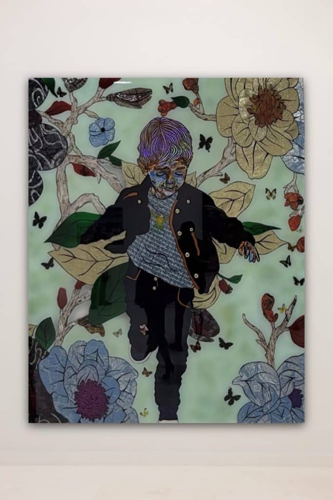 The painting, a 7-by-6-foot work titled The Boy, instantly drew guests into Mazzone’s layered, expressive universe. At first glance, it’s a portrait of childhood: a young figure chasing butterflies. But Mazzone, known for embedding meaning in every texture, takes the scene beyond nostalgia.